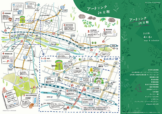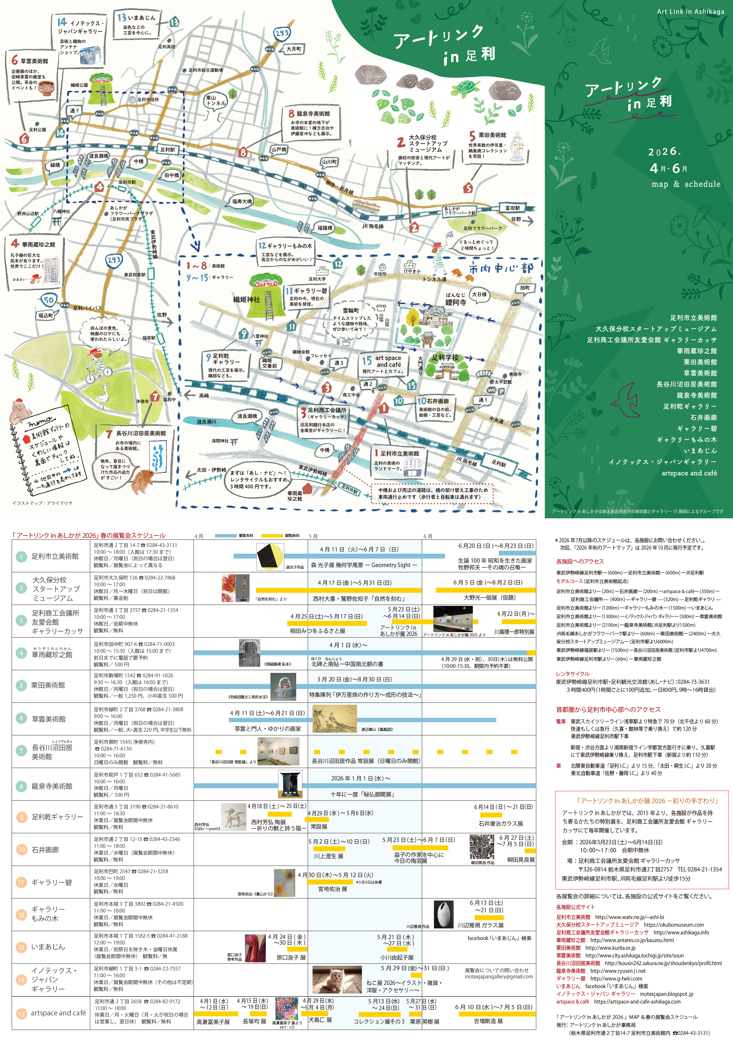 「アートリンク in あしかが」のお知らせ 足利市立美術館は「アートリンク in あしかが」に参加しています。「アートリンク in あしかが」は、栃木県足利市内の美術館およびギャラリー15施設によるグループです。また、春と秋の年2回、展覧会スケジュールを掲載したアートマップを発行しています。