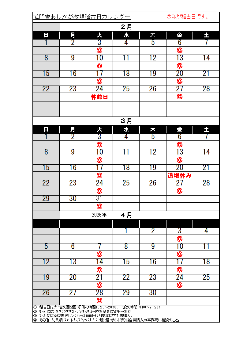稽 古 日: 火曜日、金曜日の週2回 (下表参照)
