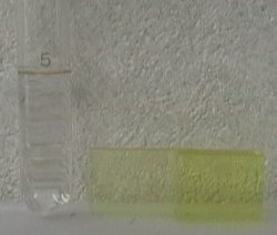浄水シャワーを通した水(5t)と 通さない水(5t)に残留塩素測定試薬(オルトトリジン錠剤)を入れて残留塩素を測定します。