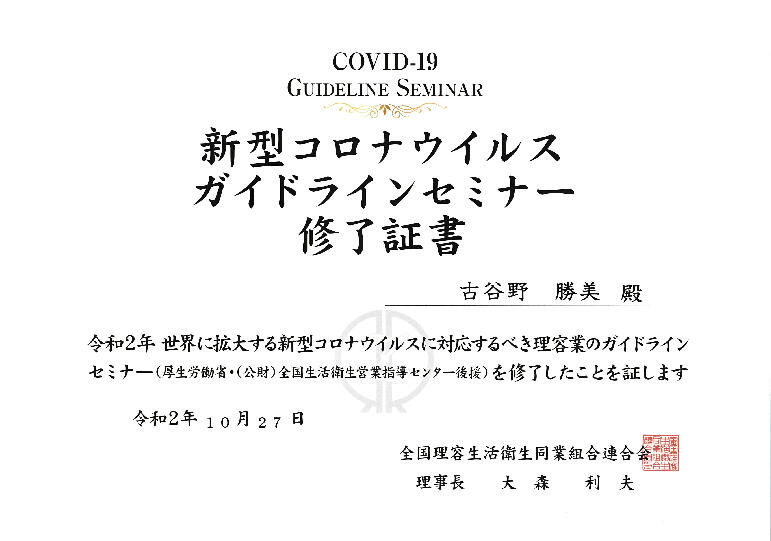 新型コロナウイルス ガイドラインセミナー受講しております。 |