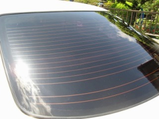 | 買って数日でつけた傷の自力修理跡(とコーナーポールの跡)。遠くから見れば目立たない。 | 後ろの窓にはフィルムが貼ってあったらしく、カッコいいけど、ちょっと暗すぎでした。 | |