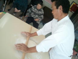 | 当センターでは、近所のうどん作りの名人をお呼びしまして、施設内で手打ちうどんを振舞っています。利用者さんの中にはうどん作りの経験者もいまして職員と一緒にうどん作りに参加しています。 |