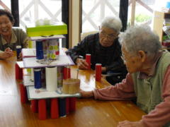 | 当センターでは、利用者さんご自身が「遊び」ながら機能訓練や健康に過ごして頂けますように、いろんなレクリエーションを通じて「遊びりテーション」を行っています。 |